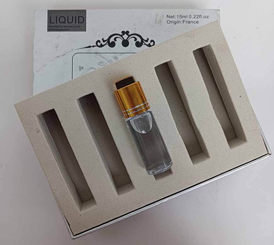 无色无味液体,可速溶于饮料、酒类、茶水中。它汇集大自然多种植物所含催情素之精华制作而成,服用本品数分钟后心跳加快全身发热内阴发痒急于交欢。